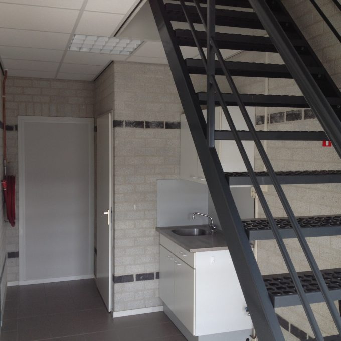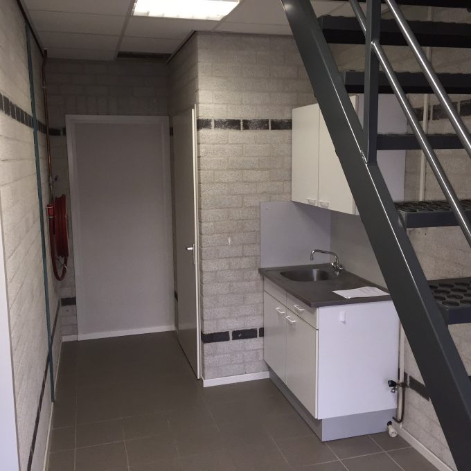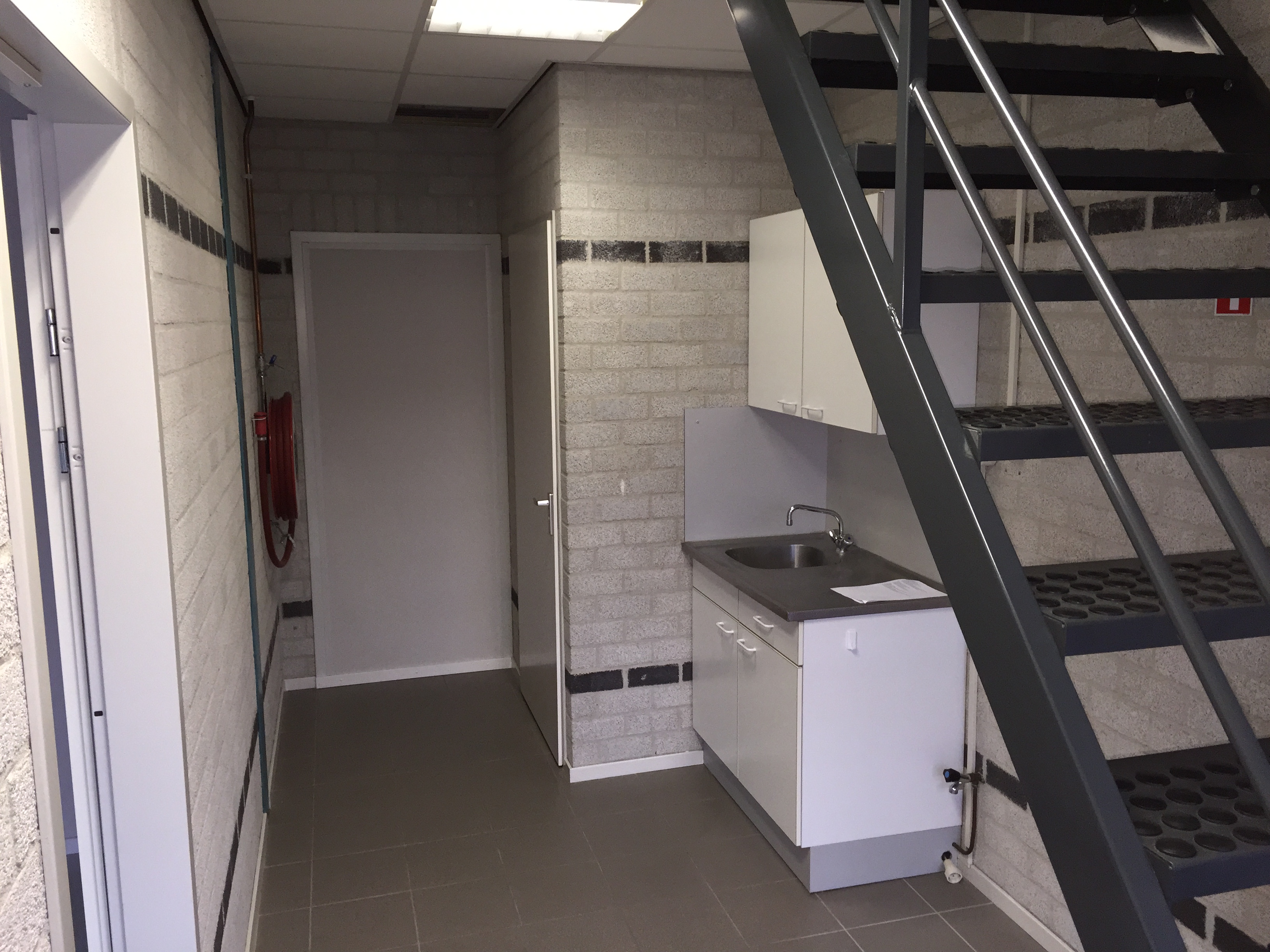 De bedrijfsruimte bestaat uit een magazijnruimte/werkplaats van ca. 72 m2, op de bg voorzien van een klein kantoortje van ca. 17 m2 en op de verdieping van ca. 55 m2  voorzien van een kantoorruimte. Unit heeft een eigen entree met toilet en keukenblok. Modern hedendaags keukenblok is nieuw en voorzien van Quooker, koelkast en magnetron.